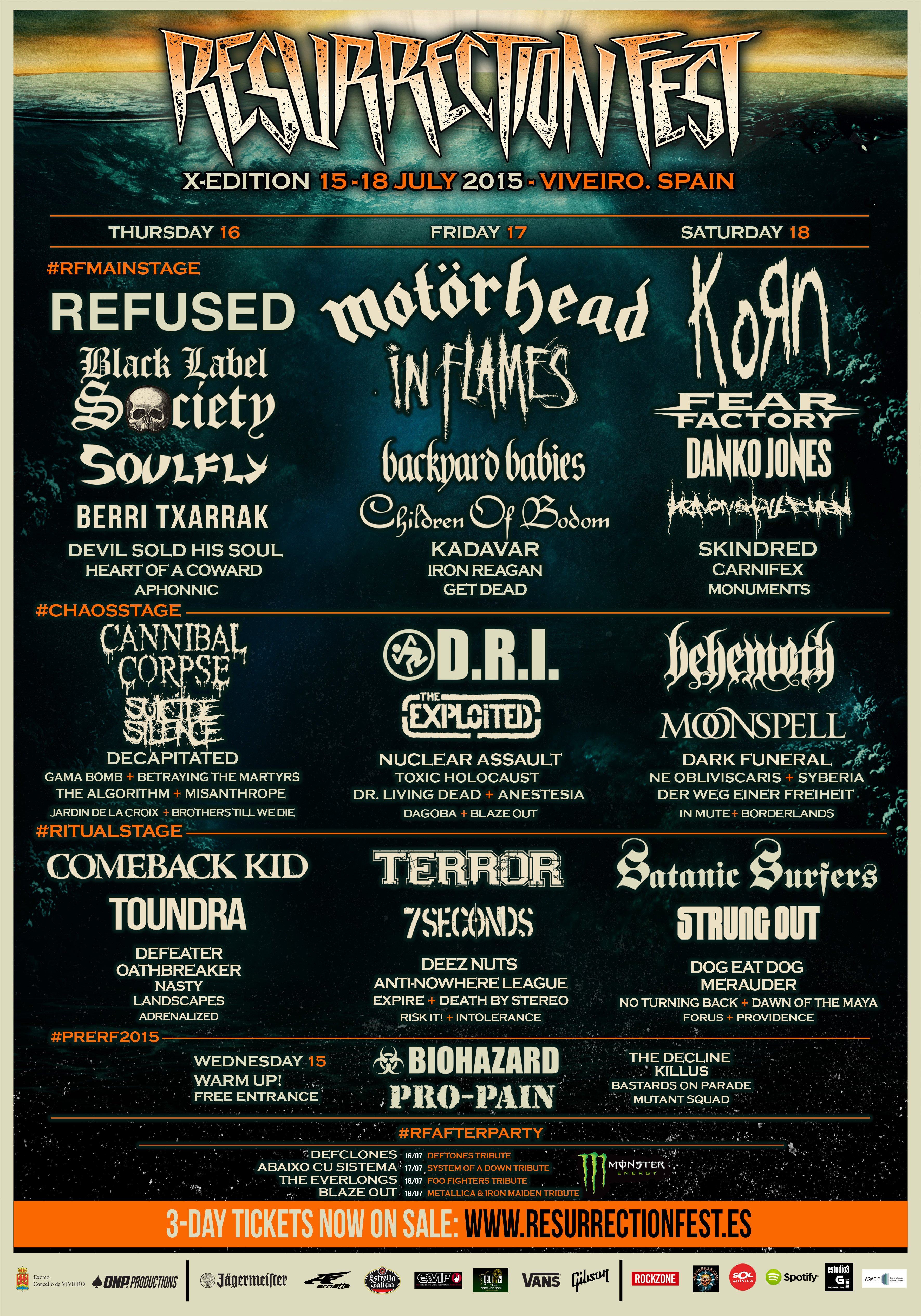 El objetivo de la organización siempre ha sido, es y será que el resurrection fest sea más que un festival, que sea la mejor semana del año para sus seguidores, con la mejor música y una experiencia irrepetible. 30/06 to 03/07 xv anniversary: Bands playing this year include:
